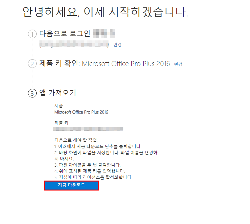 키를 입력하시고 언어 선택 완료하시면 위와 같이 등록한 상품 버전과 제품키가 출력됩니다.확인 후 ‘지금 다운로드’ 클릭하면 오피스 설치 프로그램이 다운로드됩니다.