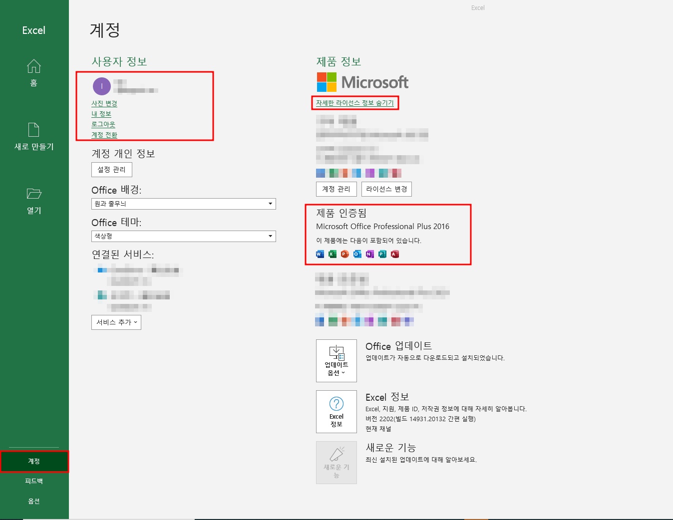설치가 완료되면 시작 메뉴에서 엑셀을 실행 시킨 후에좌측 하단 계정 메뉴를 누르고 설치된 라이센스 정보를 확인합니다.좌측 상단에 사용자 정보 확인 후, 설치 처음 단계에서 오피스 시리얼 키를 등록했던 계정인지 확인하시고,다르다면 등록했던 계정으로 계정 전환하여 로그인 해주세요.