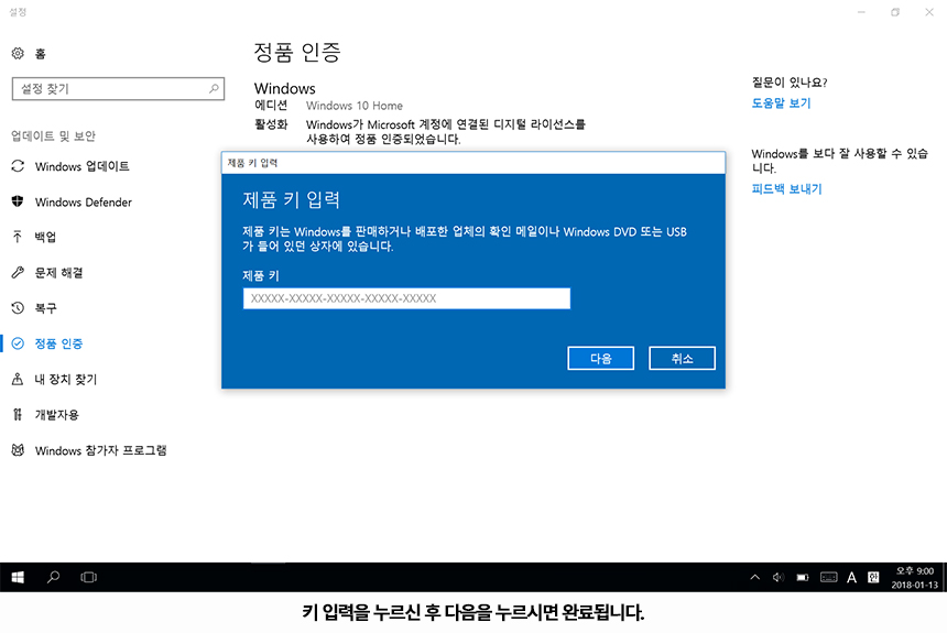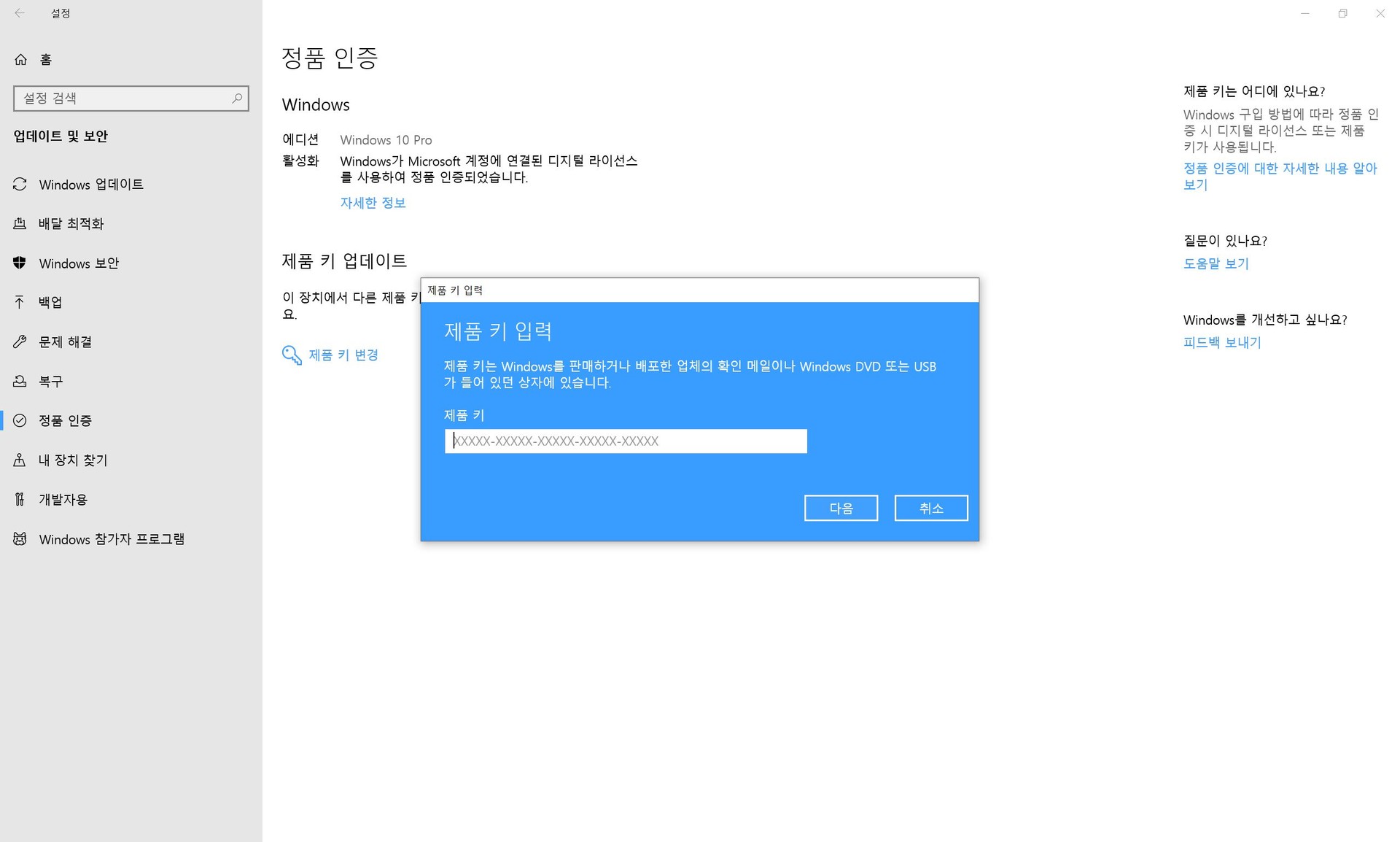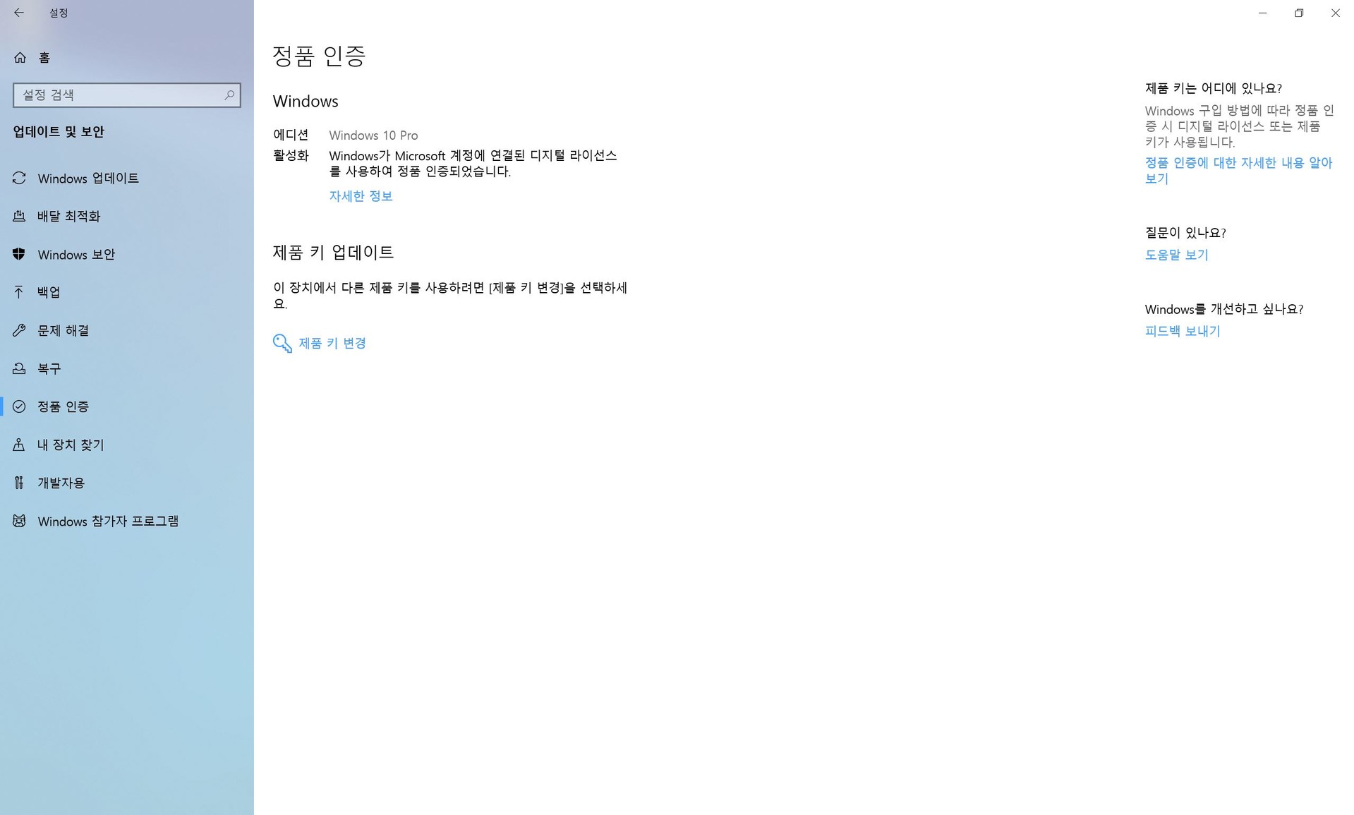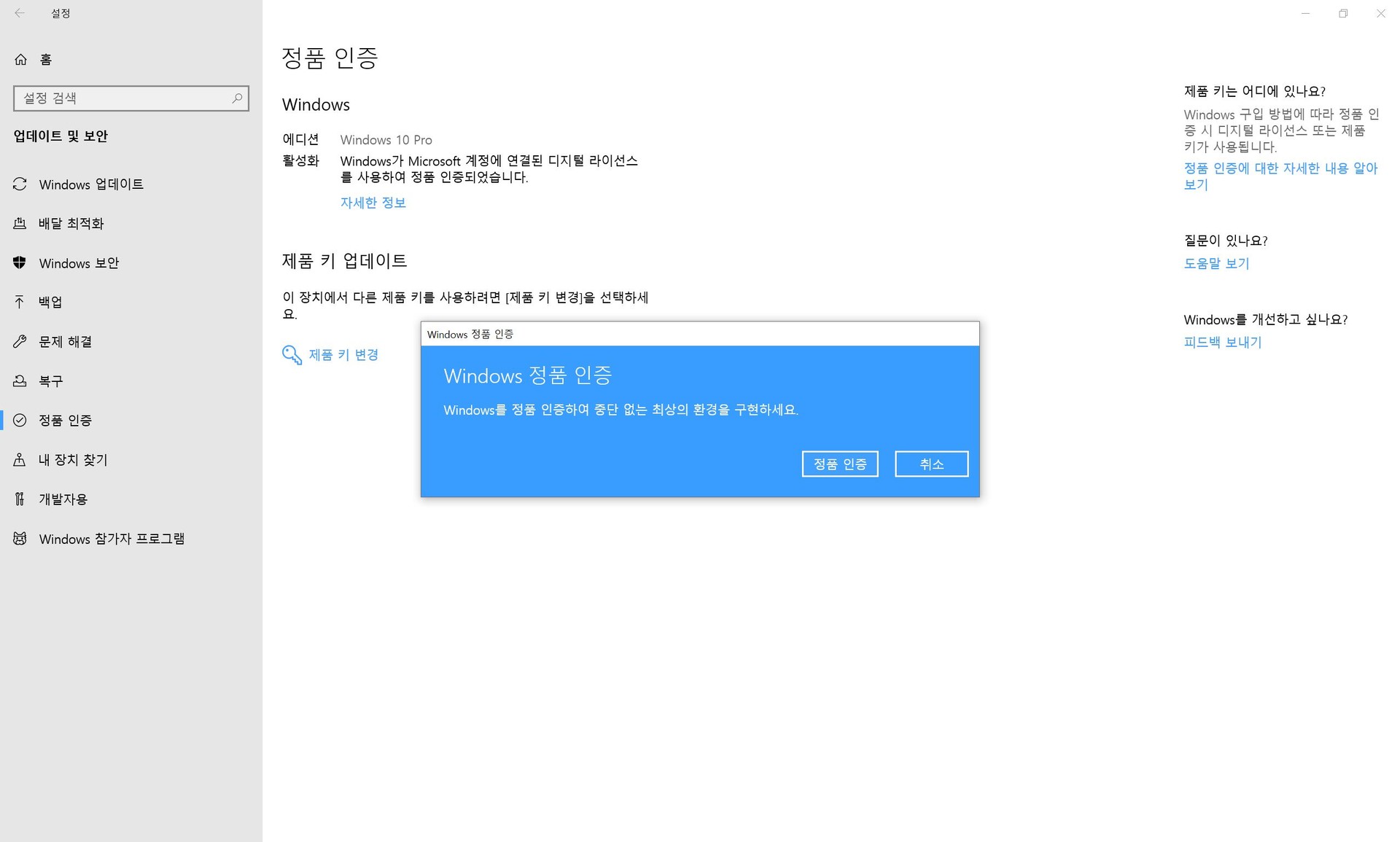 경로 : 설정 – 업데이트 – 정품인증 – 제품 키 변경