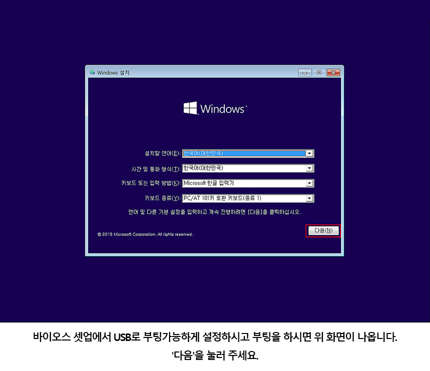 윈도우가 설치되어 있지 않은 컴퓨터에 USB를 꽂은 채로 부팅시 대체로 USB 우선 부팅이 됩니다.이미 다른 윈도우가 설치되어 있는 경우 역시 USB 우선 부팅이 설정되어 있다면,USB를 꽂은 채로 컴퓨터를 부팅하시면 아래 화면으로 진입이 됩니다.USB를 꽂은 채로 부팅하셨으나 아래처럼 바이오스에 진입이 되지 않으신 경우아래 ‘USB 부팅설정’ 버튼을 클릭하셔서 참고하시길 바랍니다.