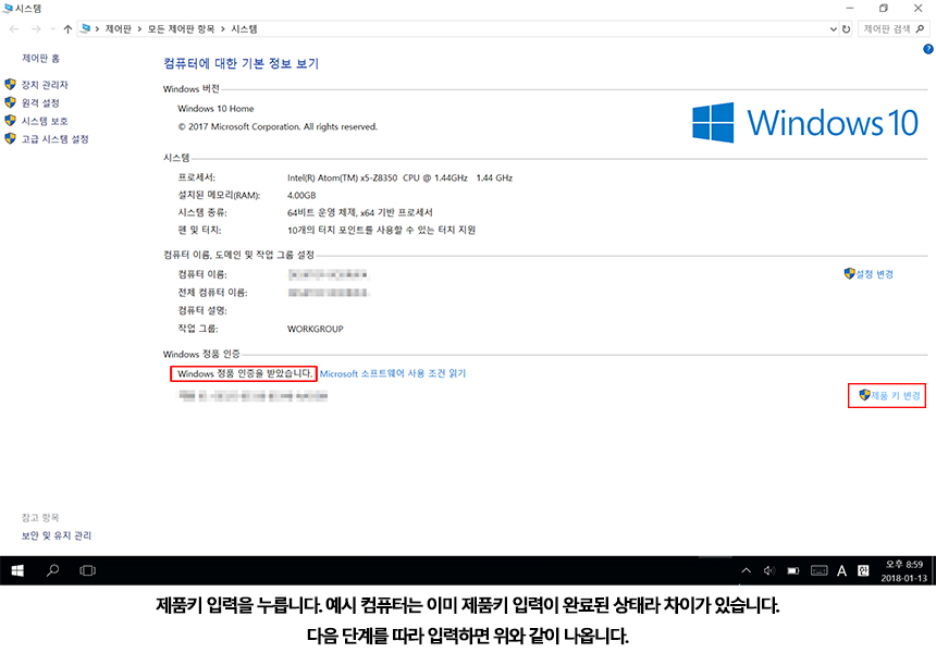 이미 윈도우10이 설치된 경우, 아래 과정 따라서 제품키만 입력하시면 됩니다.다만 아래 나와있듯 Windows10 PRo에서는 윈도우10 프로키만 제품인증되고, Windows10 Home에서는윈도우10 홈키만 제품인증이 가능합니다. 만약 이미 설치된 윈도우 버전과 구매한 키가 불일치할 경우구매한 버전으로 재설치하셔야 합니다.